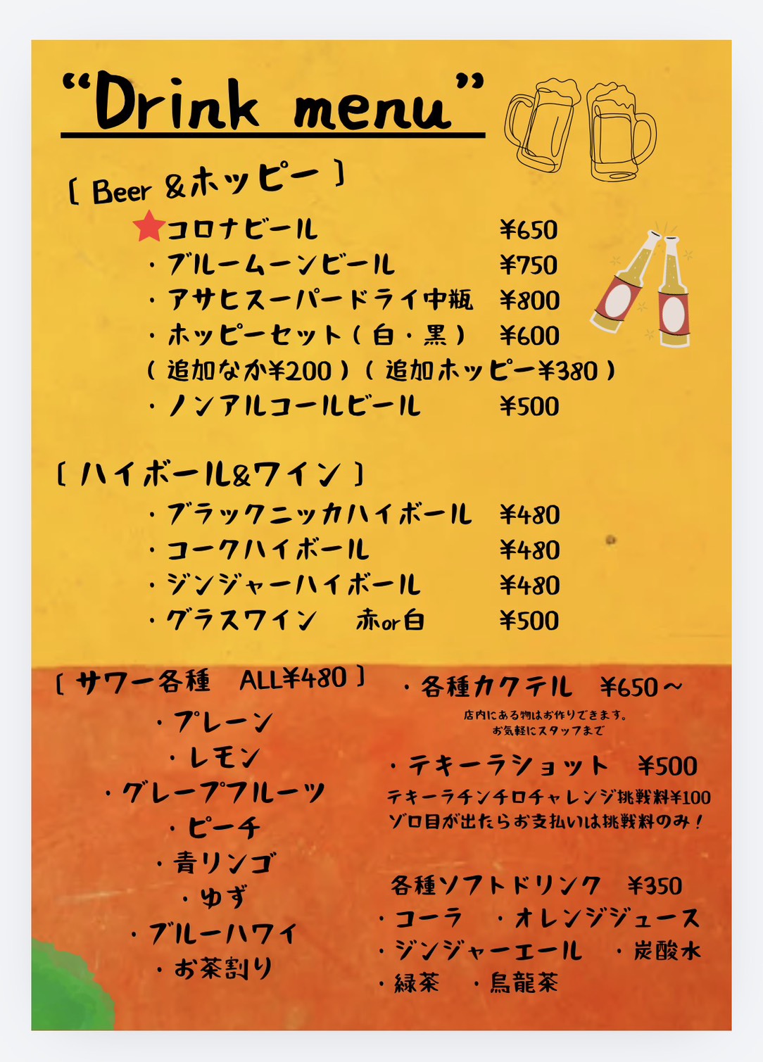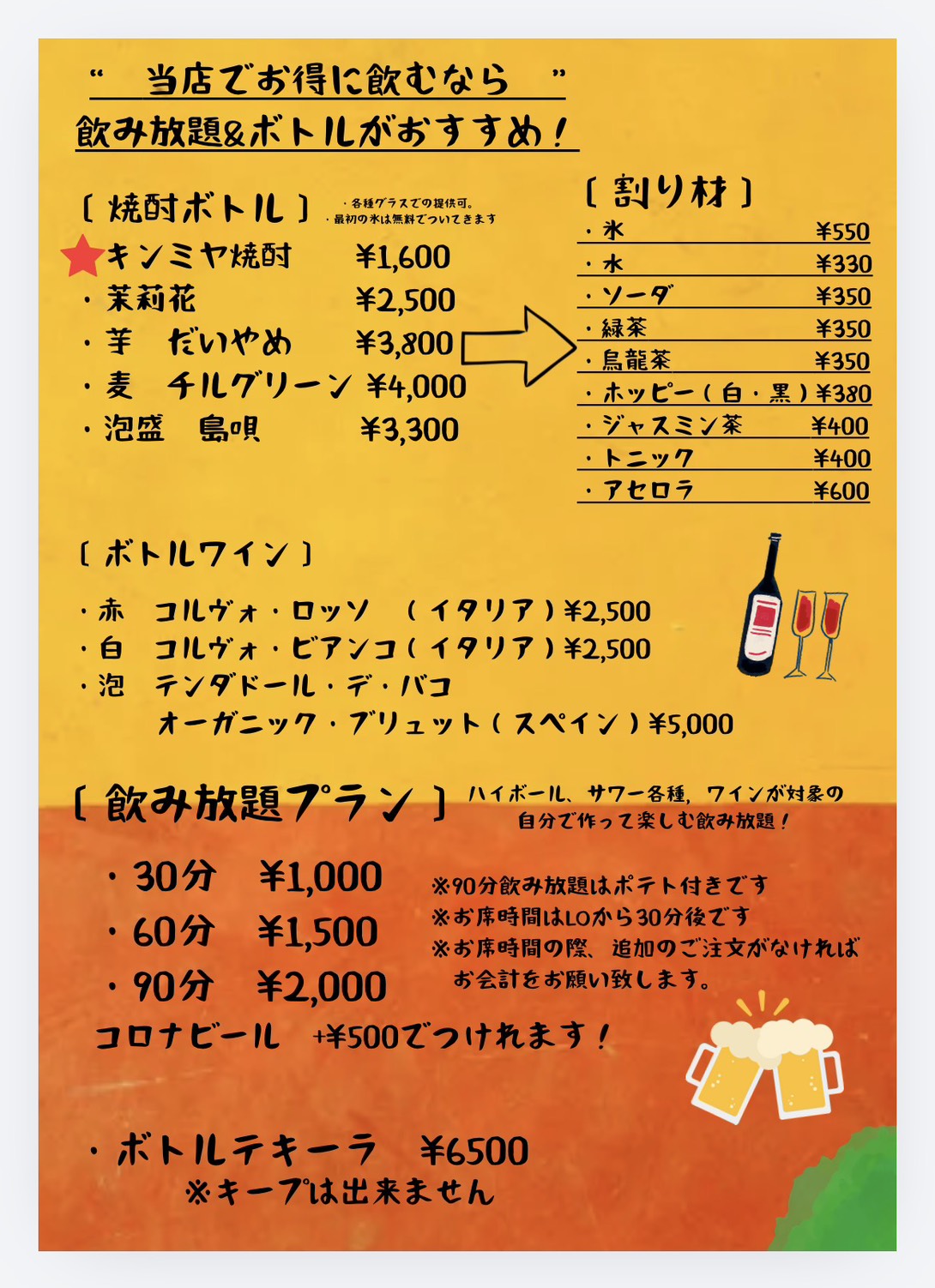 18:00〜25:00 (フードLO24:00) (ドリンクLO24:30)